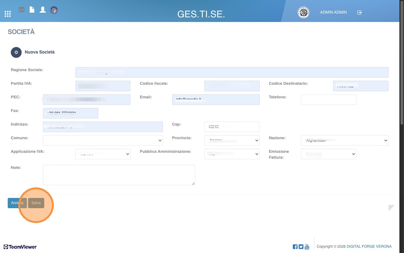 4. Una volta aperta questa schermata, inserire i dati richiesti della società che si vuole aggiungere.