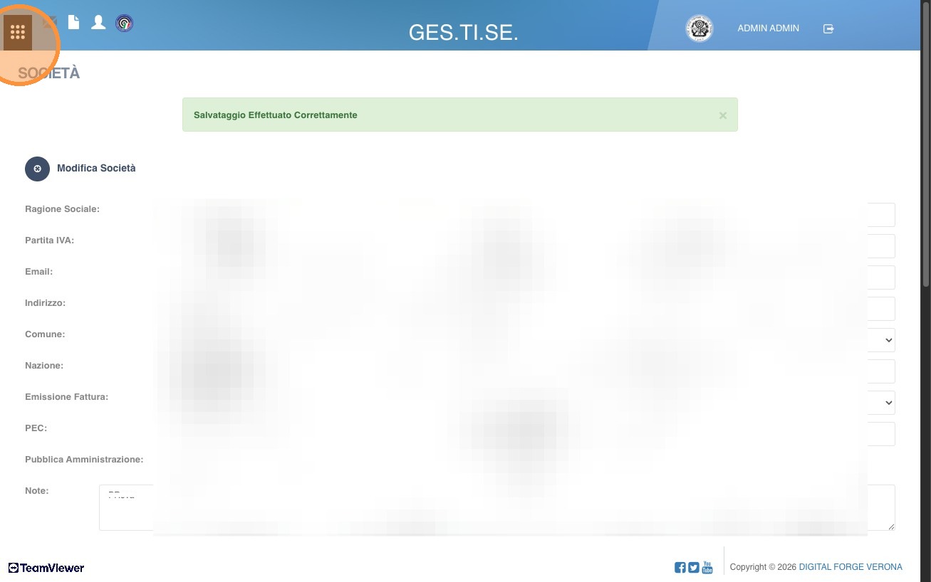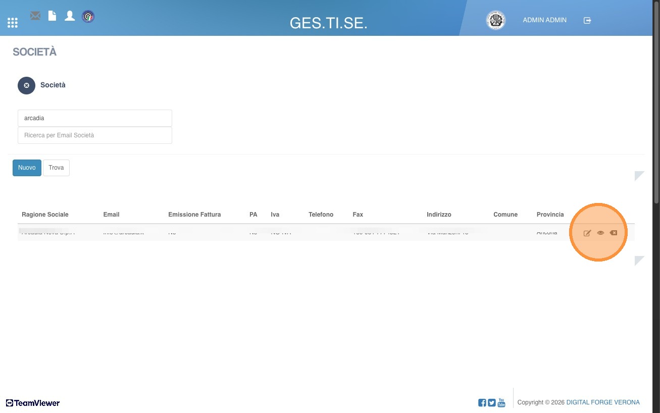 8. Se tutto è andato a buon fine verrà visualizzata la società con pulsante a destra di visualizzazione, modifica e cancellazione